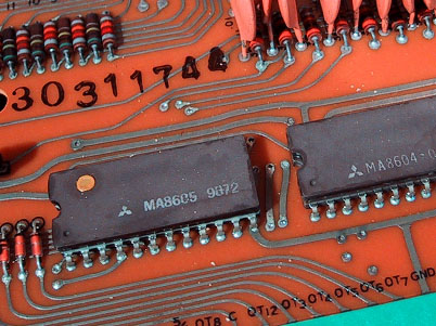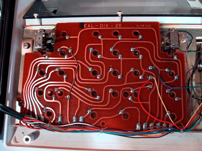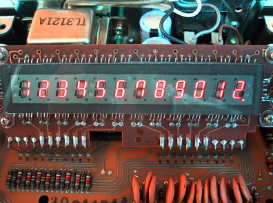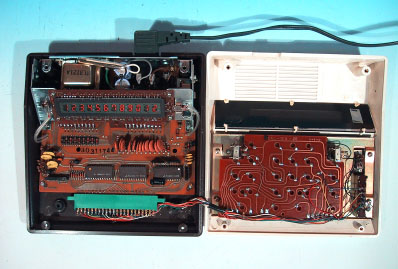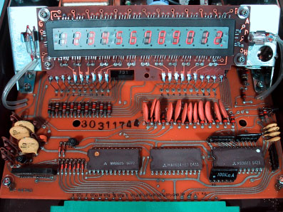 本体内部の構造は比較的簡単で、三菱製の電卓専用LSIを3個使用してい る。型番はMA8603、MA8604、MA8605の連番で、いずれも 24 Pin セラミックDIPパッケージのカスタム品である。 FIPドライバは6826と記載されたモジュール1個で対応している。こ の製品は、FIPドライバ内蔵の電卓のシングルチップマイコンが出てくる直 前の製品であると思われる。基板はベークライト製で、表面に3031174 4の捺印がある。LSIの他には、2SC740(1個)、2SC371(3 個)のトランジスタと、M58802(16 Pin DIP−IC)が使用 されている。 FIP表示は完全にモジュール化されており、7セグ表示の「日の字」が 12桁+マイナス表示用ネオン放電管+メモリ表示用ネオン放電管で構成され ている。キーボードはメカニカルタイプで、クリック音は無い。コクコクとし た押しやすいタイプだ。