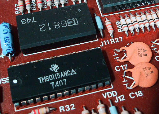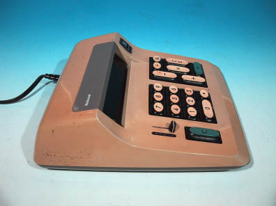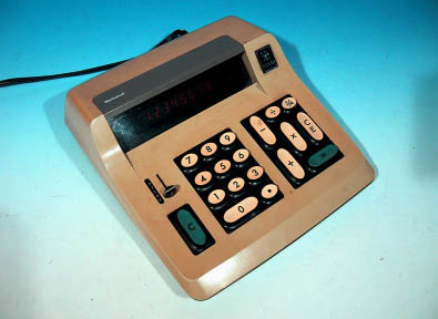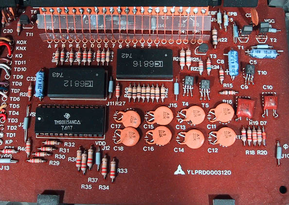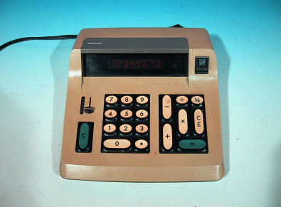 本体内部を見ると、回路の集積化とコスト削減の様子が良くわかる。回路は主 に3つの部品から構成されている。メインとなる演算ユニットは、TI社製 28Pin DIPパッケージのLSI、TMS0115ANC。1974年 7週の製造となっていた。これは、JE−800で用いられていた、TMS0 101NCの改良版と思われる。JE−800ではディスクリート部品により 構成されていた表示ドライブ回路は、JE−802では完全にモジュール化さ れている。これは、IC6812、IC6816の2個のモジュールによって 構成されている。トランジスタはわずかに、2SC828×2本と2SA56 4×1本のみ。FIP表示の採用と、ドライバ回路のモジュール化の効果は大 きく、部品点数の大幅削減に寄与している。基板はベークライト製を採用して いる。また、基板をケースに固定する際、ゴムを使う所などにも、コスト削減 が伺われる。 電源はACのみで、電源コードは本体と分離することができない。電源トラン スは、先代と比較すると若干大きくなっている。面白いのは、JE−800が 消費電力3Wであったのに対し、JE−802は5Wと逆に上がっているとこ ろである。どう考えても、ニキシー管表示の方が、FIPより消費電力が大き いと思うのだが。。。理由としては、JE−800では乾電池駆動もできるた め、周辺回路も省電力化を行っていたが、JE−802はAC電源のみの対応 となったので、その辺の制約を考えなくても良くなり、コスト重視で消費電力 は気にかけなかったためとも思われる。 JE−800と比較して、より当たり前の電卓に近づいてしまったJE−80 2であるが、当時の熾烈な価格競争を考えると、デザイン等に凝ることもでき ず、致し方なかったのであろう。