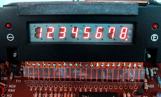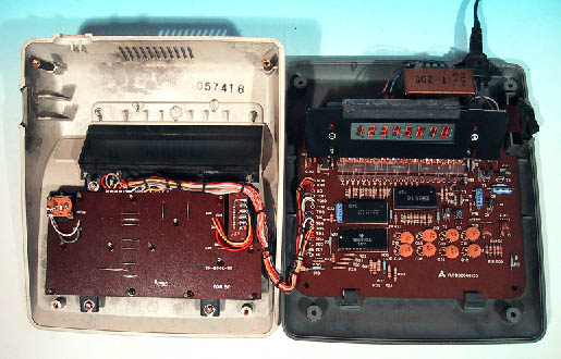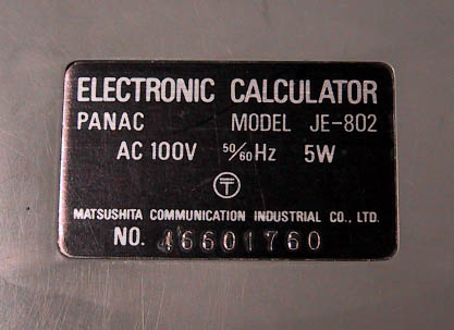 8桁表示は変わらないものの、JE−800では桁ごとに独立した8セグ型ニ キシー管を採用していたのに対し、JE−802ではオレンジ色のFIP(蛍 光表示管)を使用している。FIPは完全にモジュール構成となっているので アッセンブリは容易になった。キーは、JE−800では電磁リレーを採用し ていたが、JE−802ではおそらくはゴム接点方式を使用している。そのた め、クリック感はグニョグニョした感じがあり、あまり良くはない。なお、本 体のシリアル番号は466017605Wであった。