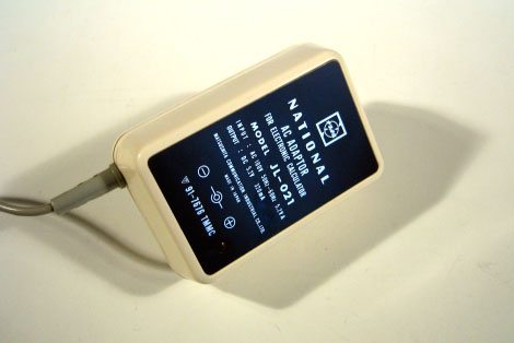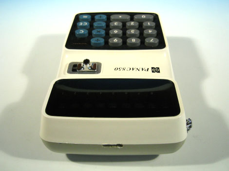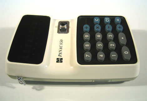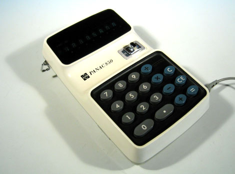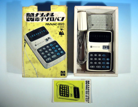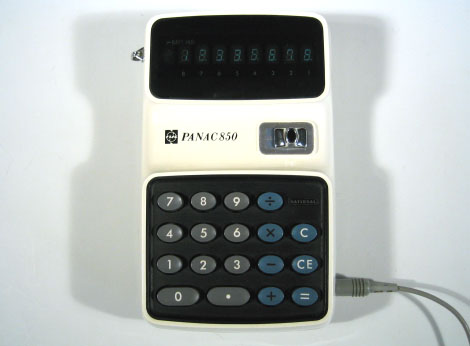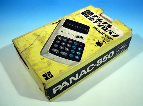 1972年製造のナショナル製8桁電卓、Panac JE-850。松下通信工業株式会社電卓事業部製造の製品である。 この電卓の特徴は、何といってもスペースエイジ感覚満点のデザインにある。たかが電卓と侮れないくらい、この造形はすごい。筆者は、数ある電卓の中でも、このJE-850は傑作中の傑作だと信じて疑わないくらい、惚れ込んでいる。表示部分とキーボード部分を上下に配置し、中央部分にくびれを持たせた形状は、セクシーですらある。ナショナルも以前は随分とオシャレな電卓を発売していたものだと感心することしきりだ。 キートップは全て楕円形のデザインで非常に深いストロークを持つ。キーは磁力リレー接点を使用している。表示は数字8桁+制御1桁の9桁表示で、桁別に分かれた7セグタイプの蛍光表示管を採用している。表示分のアクリルカバー越しに9本の表示管を見ると、思わずググっときてしまうほど魅力的だ。 電源はACアダプタ、乾電池、充電池の3電源方式を採用している。本体裏面下部には取り外し可能な電池室が搭載されており、標準で充電池ブロックと乾電池ブロックの2種類が付く。乾電池、充電池両ブロック共に、ACアダプタを接続するためのコネクタが設けられている。乾電池は単三型を4本使用する。乾電池の搭載方法は、Casio Miniのように極性の向きが同じになるように搭載する。 機能的には極めて単純で、四則演算のみの仕様となっており、メモリ機能は持たない。シリアル番号は電池室を外した本体裏面に貼付されており、本機はNO 2907531となっていた。本体裏側の銘版には、下記の表記がある。