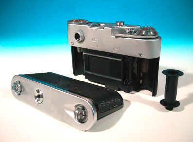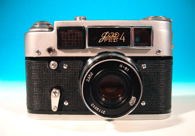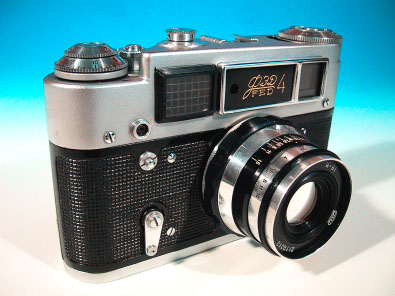 FED-4と名の付くカメラは、Type-a、Type-bの2種類が存在する。基本 的なデザイン、プロポーションは同一であったが、ロゴ周りの造形、材質 ロゴのデザインが異なっており、一見同じ型番のカメラには見えにくい。 ここに掲載したType-bは、FED-5シリーズにも通じるデザインとなってい る。FED-4 Type-aは、1964年〜1971年の間に229,566台が生産された。全 シリーズ通して合計約50万台という数は、ロシアカメラの中では一般的と 言えよう。 FED-4 Type-aは、FED-3 Type-aの発展系として製造された。大きな相違 点は、本体内部に露出計を内蔵した点で、そのため本体前面にはセレン受 光素子の窓が設けられている。プロポーションも、ただでさえ厚いFED-3 の軍艦部分を、さらに厚くしたような形で、ぼってりしたものだ。 FED-4 Type-bは、Type-aをベースに、FED-3 Type-bのシャッターメカと フィルム巻き上げレバーを取り入れたものだ。また、ロゴの文字も、本体 に刻印された重厚なものから、プラスチック板に印刷された安っぽいもの へ変更されている。 搭載されているレンズはINDUSTAR-61、52mm/F2.8。FEDシリーズでは FED-2L、FED-2 Type-e、FED-3 Typeb、Fed-4 Type-b等に搭載されていた もので、1963年製だ。INDUSTAR-61には、ここに掲載したものの他に、 61L/Dというブラックエナメル塗装されたバージョンも存在する。こちら は1977年製造のモデルとなっている。 本体は非常に大きくて重い。持った感じはFED−5と良く似ており、 まるでブローニー版のカメラのような感じすら受ける。露出計の指針は本 体上部に表示される。この部分が露出計となっており、指針の位置にダイ アルをセットし、シャッタースピードと露出を決定する。