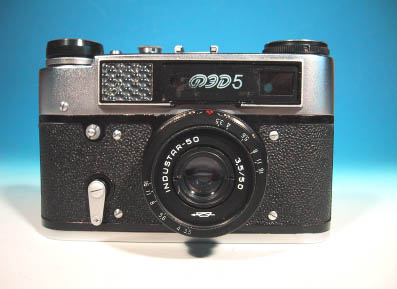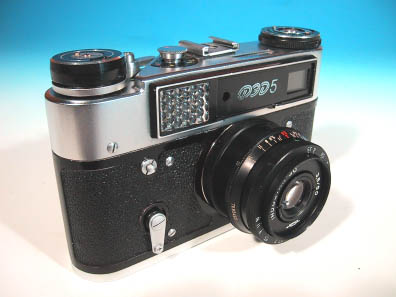 ここに掲載したFED-5は、黒いパネルの上にキリル文字でFED5のロゴが 記載されたタイプである。本来のFED-5では、この部分のパネルはシルバ ーとなっており、ロゴも角ばったタイプのフォントが使用されている。本 製品は、FED-5のバリエーションモデルである。パネルの色は、黒の他に 白もあった。またロゴのフォントも、キリル文字の他にラテン文字やオリ ンピック記念仕様のものも存在した。 FED-5は、FED-4同様、正面から見るとかなり大きなカメラに見える。あ たかもブローニー版のカメラのような堂々とした押し出しだ。これは、か なりの大きさを占めるセレン受光部を正面に配置した結果であるが、その ためお世辞にもスマートなデザインとは言えなくなっている。どちらかと いうと、野暮ったくて田舎臭い風体ではあるが、そこが逆にロシアカメラ としての魅力でもある。 軍艦部分の数値表示は、赤、黄、緑と色とりどりで記載され、なかなか 華やかでPOPな感じだ。軍艦部には露出計が備わる。露出計の左側には 露出計のダイアルに相当するリングがある。このリングを回して露出計が 指し示す数値に合わせれば、絞り値とそれに適したシャッター速度が得ら れるようになっているのだ。すなわち、自動露出では無くあくまで手動露 出となっている。 ファインダーは、若干緑色がかってはいるものの、くっきりとして見や すい。ファインダー中央部の丸い領域で、二重像を合致させてピント合わ せを行う。フイルムの巻上げはレバー式。シャッタースピード設定は、 1/30のみ赤文字で記されている。X接点はアクセサリーシューの下側に配 置されている。吊り管は搭載されていない。 本機に搭載されているレンズは、INDUSTAR-50、50mm/F3.5であったが 資料によればFED-5シリーズにはFED-INDUSTAR-61L/D、53mm/F2.8が標準 で搭載されていたようである。FED-5B、FED-5には、1980年のモスクワオ リンピックを記念し、オリンピックロゴの入ったモデルも発売された。