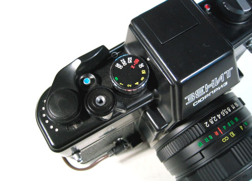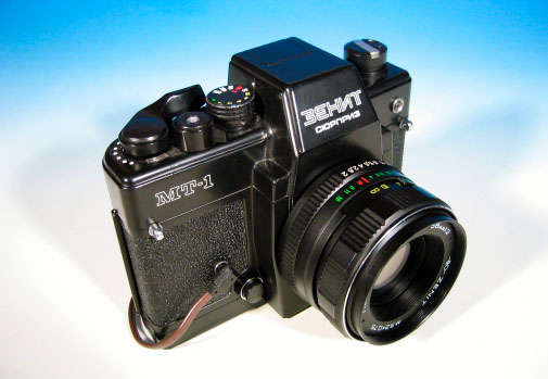 ZENITシリーズはKMZ社の一眼レフカメラとして有名である。 その中でも、特にこのSUPRISE MT-1は、非常に変わった仕様のカメラとな っている。MT-1はもともと胃カメラの写真撮影などの医療用として作られ た製品であった。 MT-1は1979年〜1990年の期間発売された。ベースとなる機種はZENIT-T1 (ZENIT-19)という、1977年〜1987年にかけてリリースされたカメラとな っている。医療用としてリリースされたMT-1は、バヨネットマウントの固 定焦点レンズを搭載しており、レンズ先端には、顕微鏡や胃カメラに固定 するためのクランプが付いていた。ここに掲載したモデルは、それとは異 なるバージョンのもので、42スクリューマウントを搭載したハーフサイズ の一般的な仕様となっている。ハーフサイズカメラではあるものの、外観 はフルサイズ一眼レフと同じくらいの大きさがあり、大変に重い製品だ。 資料によれば、MT-1には以下の3つのタイプが存在していたようだ。 ・バヨネットマウント、ハーフサイズ版、レンズ固定焦点 ・42スクリューマウント、ハーフサイズ版(1985年リリース) ・42スクリューマウント、フルサイズ版(1986年リリース) それぞれの機種がどの程度製造されていたのかは不明であるが、現在の中 古市場では、目にするモデルのほとんどが固定焦点のバヨネットマウント 版であり、42スクリューマウントのハーフサイズ版は極めて数が少ない。 一眼レフ、ハーフサイズという仕様も若干特殊であるが、記録用カメラ らしく本体背面には0〜31までの数字をフィルムに写しこむことができる デートパックが搭載されているところも特徴的だ。このデートパックであ るが、本体シャッターとシンクロさせるため、背面に搭載されたパックか ら本体正面へコードが取り付けられている。こういった思い切ったことを 臆面も無くやってしまうところがすごい。 シャッターはメタル製で、縦方向にスライドする。シャッター速度は Bから1/1000まで、12段階に設定可能だ。シャッターボタンにはロック装 置が付いており、不用意にシャッターが下りないような仕組みとなってい る。シャッターの動作音は「騒音」とも呼べるほどうるさいものだ。 メカの一部は電子化されており、本体底部には日本では既に製造を中止 してしまった水銀ボタン電池「625A」を2個搭載する。これとは別に、デ ートパック用として、同電池3個を使用する。本体動作用電池の残量確認 は、ファインダー左横に搭載されたLEDでチェックすることが可能だ。 本機の場合、レンズはHELIOS-44M-4、58mm/F2.0が付いてきた。当然の ことながら、42スクリューマウントレンズであれば交換することができる ため、例えばMIR-20Mといった20mm/F3.5という広角レンズを搭載して楽 しむことも可能である。