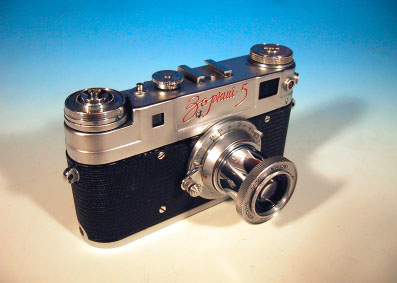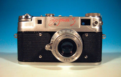 ZORKI-5の初期型と2nd-Versionとの相違は、ロゴ表記とレンジファイン ダー窓の形状、及びトッププレート前面のデザインがあげられる。2nd- Versionでは楕円形のロゴプレートが貼り付けられているが、初期型では 金属面に刻印されており、しかもその色が赤となっている。このデザイン は、いかにも冷戦時代のソ連を象徴しているようだ。シンクロ接点はXとM の両方が搭載される。シャッタースピードは開放から1/500まで、6段階 に設定可能。ファインダーはFED-2のものをベースとしており、焦点は中 央に表示される四角い部分で2重像を合致させれ行なう。ファインダー内 部は明るく見やすい。 ここに掲載したZORKI-5初期型に搭載されるレンズはKMZ社製では無く、 モスクワ近郊のLutkarinoというところにあるKMZ社系列の工場、LZOS (Lytkarino Optical Glass Factory)で製造されたものである。型番は INDUSTAR-50、50mm/F3.5と同じであるが、レンズに記載されているロゴ マークが異なっている。このレンズは、ZORKI-5及び6に、標準で搭載され ていたようである。