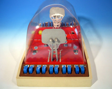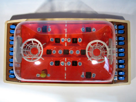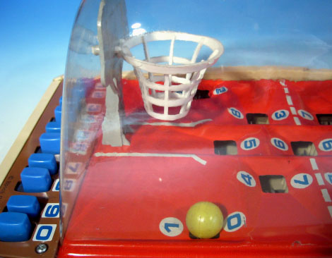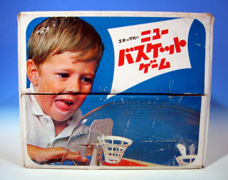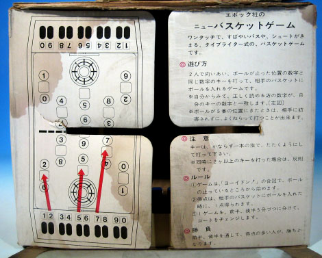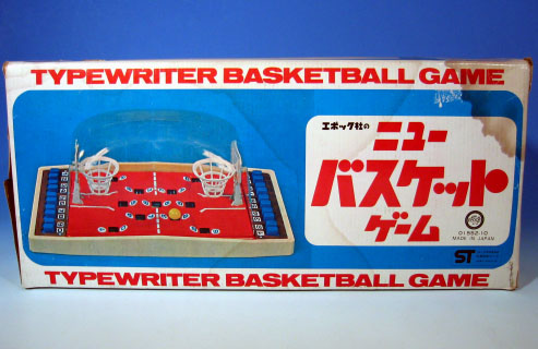 タイプライターシステムなる仕組みを導入した、完全無電源方式の古典的なゲーム機、「エポック社のニュー・バスケットボールゲーム」である。必ず2名必要で、一人遊びは不可能、というより、このゲームを一人でやってる人がいたら、ちょっとコワイよ!。操作は説明するまでもなく簡単で、窪みに入ったボールを、数字キーを押して跳ね上げさせ、ゴールを狙うというもの。数字キーは0〜9まで10個設けられている。2名が向かい合って遊ぶが、数字は正逆両方向に記載されている。向かって正しく読める方が、自分の数字になる。当然、ノロノロしていると相手に先に跳ねられてしまうので、俊敏な動作が必要となる。 一箇所だけ自分だけしか打つことができない、専用の窪みというものが用意されている。「5」と書かれた場所がそれで、ここにボールが入った時は、ゆっくりとねらいを定めて打つことができるというわけだ。とはいっても、どうやって狙いを定めるのか?というような突っ込みの余地は残るが。 注意点として箱に記載されている項目は、キーは必ず1本の指で押すこと、 また同時に2つのキーを押さないこととある。そりゃそうだ。全部のキーを押していたのでは、ゲームもクソもあったもんじゃない。実際キーを操作してみるとガチャガチャとびっくりするくらい大きな操作音がする。これを夜中にやった日にゃあ、苦情が出ること間違い無しであろう。子供向けのゲーム機ということもあり、結構タフな造りにはなっているとは思うが、興奮してくるとキーを叩きつけても大丈夫なのかどうかは不明。体力と反射神経を競う、健全な時代の古典的ゲームである。(それにしても、外箱に印刷されている子供の顔、なんとかならんかいな?^^;;)