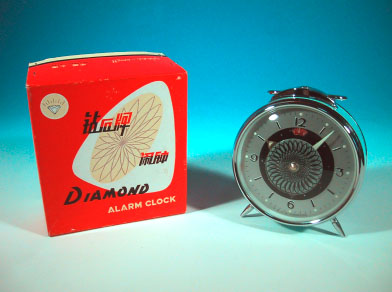 中国・上海製のダイアモンド牌アラームクロック。日本でも中国雑貨専門店が かなりの数仕入れていた商品である。同ブランドのデザインは多岐に渡り、これ 以外でも多くのバリエーションが製造されていた。さすがに最近は、このような ゼンマイ仕掛けの時計は少なくなってきている。 この時計、何と言っても配色とデザインが秀逸。純メカニカルであるという構 造も今となってはレトロで珍しいが、寝ぼけた水色の本体と、文字盤中央のなに やらワケの判らないデザインが怪しさと野暮ったさを演出している。中央に配置 された円板は2枚構成になっていて、秒針のように常時回転している。2枚のう ち回転するのは上の1枚のみで、下の板は固定されている。写真でも判るように 円板には妙な模様が書かれており、動作中はワサワサとこの模様が動くという、 実にイミプ〜な仕掛けとなっている。箱のデザインも昔っぽくてグッド!逆に今 でも十分通用すると思うのだが。