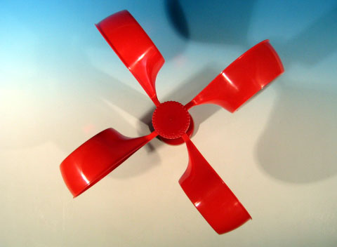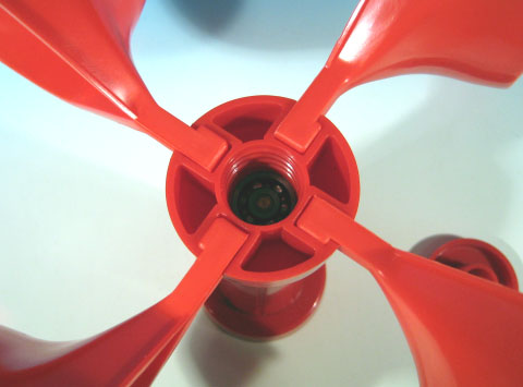 本体は、箱の中に分解された状態で格納されている。組上げは簡単で、中央支柱上部の蓋を「OPEN」方向に回して取り去り、4箇所のノッチに翼を差し込んだ後、蓋をかぶせて「CLOSE」の方向に締め付けて完成。ものの5分もかからない。写真で見るとそうでもないが、組み立てて見ると意外に大きく良く目立つ。細かいところでは、回転部分にボールベアリングを採用しており、わずかな風でも良く回るように出来ている。支柱裏面には強力な磁石が搭載されているので、車の屋根に取り付けても倒れる心配は少ない。