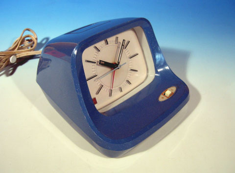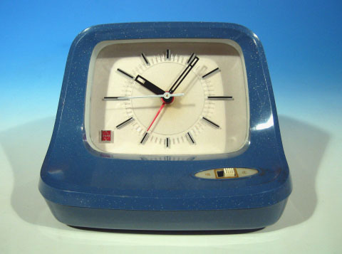 「スヤスヤピヨ」という絶妙の商品名を持った電気目覚まし時計。1970年代スペースエイジのデザインが秀逸。とてもナショナルらしからぬデザインだ。全体の雰囲気は、どことなくダルマさんを感じさせる。ころころと丸っこくてカワイイところが非常に気に入っている。スヤスヤピヨという商品名の通り、夜中でも文字盤を明るく照らすことができ、アラーム機能内蔵でピヨピヨと音が鳴る。松下電工株式会社製造、50Hz専用品。定格はAV単相100V 3Wとなっている。 アラームのON/OFFは前面パネルに設けられたスイッチで行う。本体上部のスイッチを押すと、ランプが点灯し、夜間でも文字盤が見える仕組みだ。本体下部に照明用ランプ取り替え口がある。ランプは30V 30mA仕様。補助ランプ1個付き。
