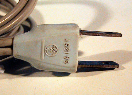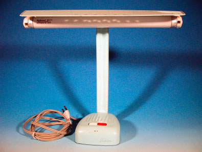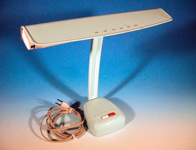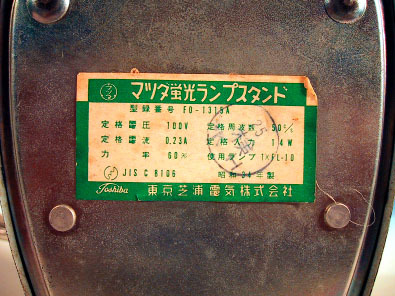 台座部分には点灯/消灯用の白と赤のスイッチが並ぶ。今でも十分使用するこ とができ、多少点灯するまでの時間が長くかかるもののきちんど動作する。但し 変圧トランスがかなり熱くなるので、実用には不向きであろう。インテリアとし てはレトロ感覚抜群で最適である。 本体台座の裏には銘版シールが貼付されており、下記の記述があった。 マツダ蛍光ランプスタンド 型録番号 FO−1315A 定格電圧 100V 定格周波数 50c/s 定格電流 0.23A 定格入力 14W 力 率 60% 使用ランプ 1×FL−10 JIS C 8106 昭和34年製
