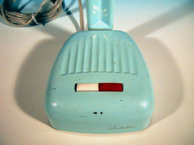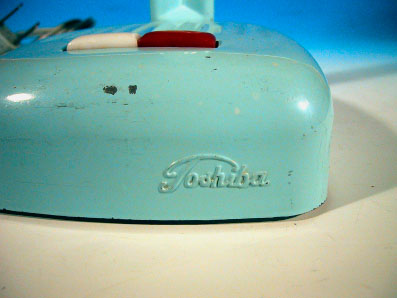 寝ぼけた水色が郷愁を誘う蛍光灯スタンド、マツダ蛍光ランプスタンドだ。 小学生の頃、このようなスタンドを机の上に置いて勉強した記憶のある方も多い であろう。筆者もその一人。量産を優先した合理的なデザインとプラスチック素 材を多用した安っぽい作りの現代製品とは一線を画し、手作り感覚に富んだ総ス チール製の蛍光ランプスタンドである。メーカーは、既出の「マツダ 乾電池ラ ンプ」と同様、マツダと東京芝浦電気のダブルネーム。シェード部分には「マツ ダ」、台座部分には「Toshiba」の刻印が入る。製造年月は昭和34年。