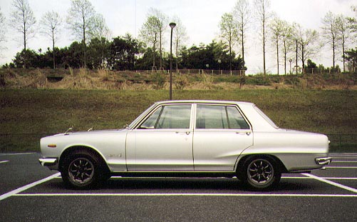 ・撮影日 :1998年04月13日(月曜日) ・撮影場所 :京王多摩センター駐車場 ・使用カメラ:Konica Z-UP80 ・コメント : 日産スカイライン GC10型 側面 スカイラインの特徴である「サーフィンライン」が見える。このライ ンは、流体力学的に優れた魚の形にヒントを得たと言われており、C 10系のボディをデザインする際のテーマである「スピード・フォル ム」を表現し、かつパネルに剛性を持たせる意味でも有効であった。