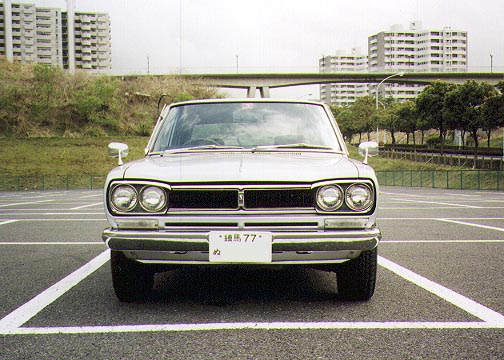 ・撮影日 :1998年04月13日(月曜日) ・撮影場所 :京王多摩センター駐車場 ・使用カメラ:Konica Z-UP80 ・コメント : 日産スカイライン GC10型 正面 フロントグリルは、後期型セダンのもので、ワンピースタイプ。本来 なら、向かって右側に「200GT」のエンブレムが付くが、この車では 紛失している。