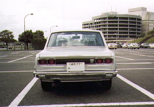 ・撮影日 :1998年04月13日(月曜日) ・撮影場所 :京王多摩センター駐車場 ・使用カメラ:Konica Z-UP80 ・コメント : 日産スカイライン GC10型 背面 テールランプは4灯式であり、ブレーキを踏むとウインカーの視認性 が落ちる。これは、ウインカー専用ランプを持たない当時の車では、 致し方無いことでった。バックランプは、リア・バンパーの両端に位 置している。