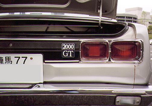 ・撮影日 :1998年04月13日(月曜日) ・撮影場所 :京王多摩センター駐車場 ・使用カメラ:Konica Z-UP80 ・コメント : 日産スカイライン GC10 リアエンブレム リアに配置されている 200GT の青バッチ。ブレーキランプとウイン カーの下には、バックランプが配置されている。