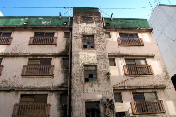 いつ頃の建物なのかは不明であるが、階高が低いことと外壁のコンクリートがかなり傷んでいることなどから、昭和30年代に建てられた可能性が高い。不法侵入者を防ぐため、一階部分は完全に壁で覆われており、建物内部に入ることはできない。建物の正面を見ると、クーラーの室外機ユニットや植木鉢などがまだ残っており、最近まで使われていたようではある。建物の端は、あたかも切り取られたようになっている。以前他の建物と接していた名残かもしれない。