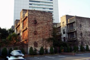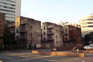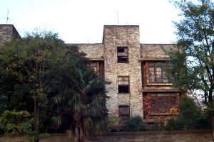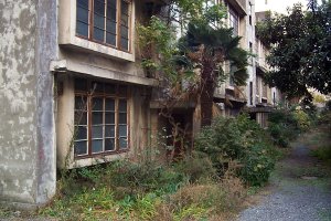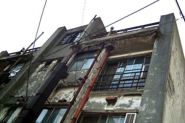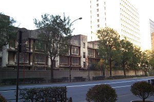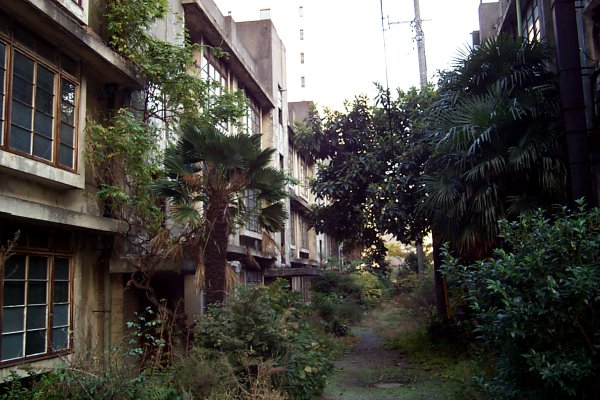 ここに掲載する九段下のアパートは、残念ながら既に取り壊されてしまい、現在は存在しない。ここに掲載した写真の撮影を行ったのは1999年12月のことであったが、再度訪問してみたくなり、3年後の2002年12月に訪れてみた。しかし、アパートは取り壊された後であり、跡形も無くなっていた。東京都のど真ん中にある廃墟系建造物であったが、いつのまにかひっそりと姿を消してしまった。 このアパートを見つけたのは車で首都高速を走行している時である。東京駅の近傍を通過してちょうど神田インターを過ぎたあたりの左下に見ることができた。首都高速の高架からはアパートの屋上が良く見えるのであるが、雑草が生い茂りまるで空中庭園の様相を呈していた。壁面には蔦がからまり、人が住んでいるようにも思えない。そのあまりにも非現実的な光景に魅かれて、取材を行った。なお、正確な場所は内堀通りに面したところで、さくら銀行本店と関東信越国税局総合庁舎との間に当たり、現在は千代田区役所が建っている。