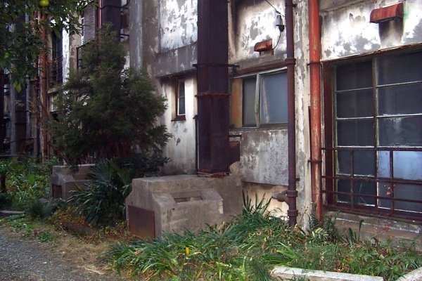 アパート裏側は首都高速の高架とその下を流れる川に面しており、日当たりが悪いためか壁面に蔦は無い。外装はペンキが剥がれ落ち、手入れは全くされていないように思える。アパート入り口から観察すると、アパートの入り口は各棟の南側に並んでおり、1棟につき4箇所の入り口が設けられている。各棟の裏側にはダストシュートと思しきものがあり、地面には落ちてきたゴミを収集するためのコンクリート製の箱が配置されていた。