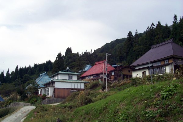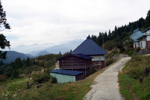 大草連の家屋は、中谷川に向かう斜面沿いに点在していた。道路脇の庚申塚を見ながら奥へ進むと、道はますますきつい登りとなる。集落のはずれには段々畑が連なり、その先は大渚山への登山道のようになっていた。村の外れから中谷川方面を望むと、あいにくの曇天の彼方に、はるか栂池高原方面の山々が連なって見え、幻想的な景色だった。訪問中、自動車はおろか通行人にも会わないほど、静かな集落であった。 |