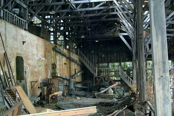 | 写真14.鉱山工場の一番下の部分(第一層)に入ったところ。右手がガラス張りの正面になっている。奥に見える階段は、第二層部分に上るためのもの。二層部分への階段は、一層部分の両端に設けられている。一層部分には、特に機械類は放置されておらず、荒れ放題になっている。建物左手に開けられた侵入口から入って、まず飛び込んでくる光景が、これである。 |