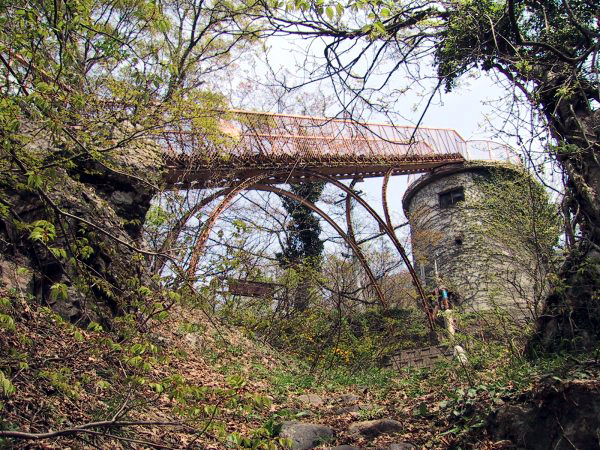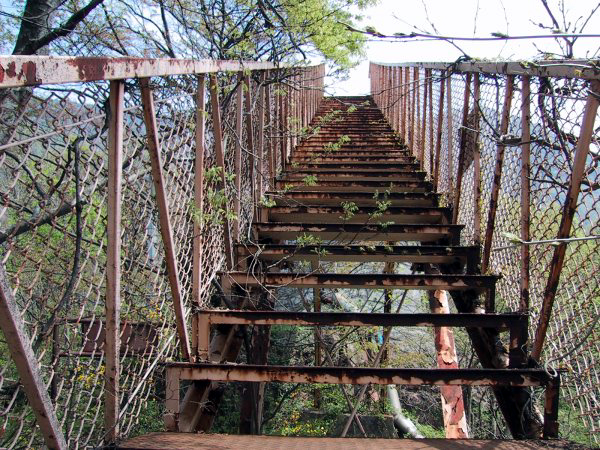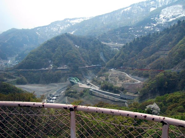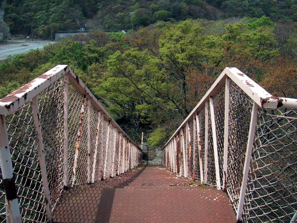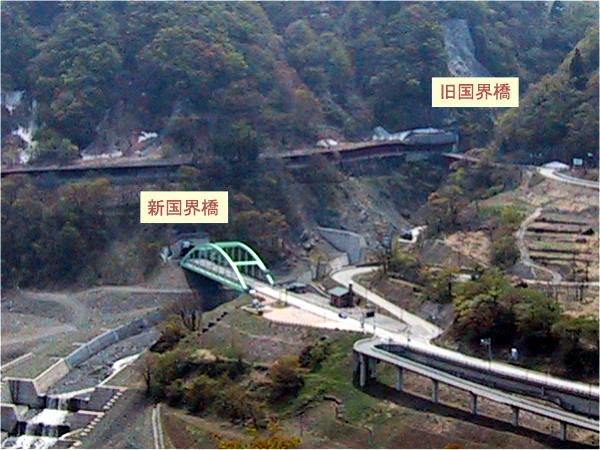 | 揚湯ポンプ塔の周りは雑草が生い茂り、定期的にメンテナンスされている感じでは無い。人が通った形跡はほとんど見当たらない。塔の周りには蔦がからまり、荒れ果てた感じである。以前は展望台として利用されていたようで、アーチ型の看板のようなものが残っていた。はっきりと覚えてはいないのだが、電気化学工業株式会社が管理しているような表示を見た覚えもある。塔の屋上は展望台になっており、斜めにかかった鉄製の階段を上れるようになっている。腐食による抜け落ちが怖かったのだが、とりあえず頂上に登ることができた。 頂上からの眺めはさすがに良い。地上から目立つところに建っているだけのことはあり、遠くまで見渡せる。残念ながら日本海は見ることができなかったが、葛葉峠付近の地形は一目で見渡すことが可能だ。写真6bは、新旧の国界橋のアップ。川下にかかる緑色の橋が、1995年の水害後に建設された新しいもの。ちょっとわかりにくいが、上方にかかる赤い橋が、もとからある国界橋である。このあたりは、前出「猫鼻温泉跡」の項目でも示した通り、1995年7月の集中豪雨により、大きな水害が出た地域の中心部である。 |