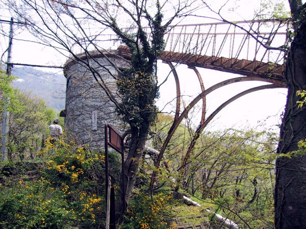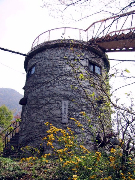 ここに掲載する建造物は、もしかしたら現在も実際に使用されているものかもしれない。一見いかにも廃墟系であったことから、取り上げてみた。筆者は小谷温泉山田旅館を定宿とし利用しているが、この建造物は小谷訪問時に見つけたものである。国道からは山の頂上に突き出た展望台のように見えるのだが、利用されているフシは見当たらず、なおかつかなり荒れているように思え、以前から気になっていたものだった。小谷温泉に行くたびに、遠くからは何度となく見ていたが、なかなか近寄る機会が無かった。2001年5月に訪問した際、ようやくその詳細を調査した次第である。