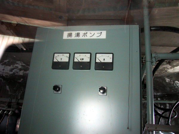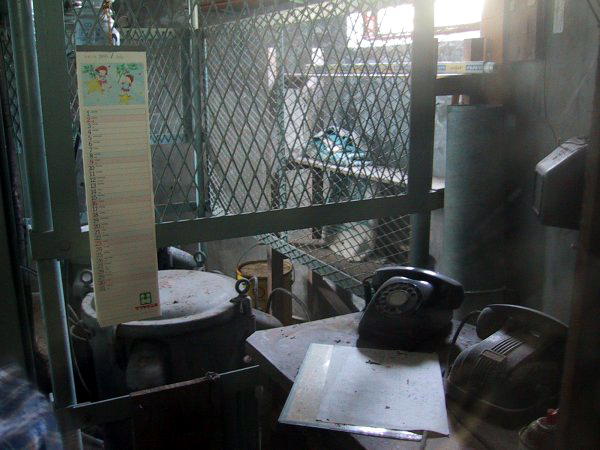 | 揚湯ポンプ塔内部は、外壁についた螺旋状の階段を登って塔の中ほどに設けられた入り口から入る。鍵がかかっているため内部には入ることができなかったが、ドアの窓から中を見ると、揚湯ポンプ制御用の機器と連絡用の電話等を確認することができた。揚湯ポンプは稼動しておらず、計器は0をさしたまま止まっているようだった。建物の中に張られたカレンダーは1995年1月を示していたので、少なくともその時までは使用されていたものと思われる。電話機には埃が堆積し、ここ半年くらいは全く利用されていないように思える。この施設が現在も利用されているのかどうかは不明であるが、展望台としては、かなり前から利用されていなかったように思われる。最も、このような山奥までわざわざ登ってくる観光客が、果たしていたかどうかは疑問ではあるが。。。。 |