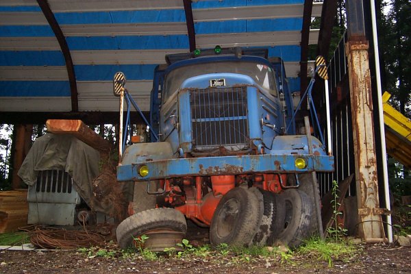このトラックは、地元の林業関係の会社が所有していたもののようで、ドアには「田村林業有限会社」の記載が見受けられた。ヘッドライトは、おそらく取り外されてしまったのであろう。日野自動車製のトラックで、飾り気の無い無骨なグリルが、なかなかの迫力だ。サイドミラーに施された、注意を促す黄色と黒のストライプ模様も、リキが入っている。まさに男の仕事場といった雰囲気。聞く所に寄ると、ダイハツやマツダが製造していた昔の3輪トラックなどのサイドミラーは、後方視界を確保するために、極めて長いロッドに取り付けられていたそうである。そのため、ちょっとした不注意から、サイドミラーを折ってしまうユーザがかなり多かったそうだ。そのためかどうかは判らないが、このトラックには黄色と黒の縞々模様が描かれていたのだろうか?