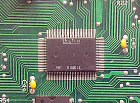 ■VDL 社製 ASIC チップの拡大写真。 このチップの使用により、汎用 TTL の個数が大幅に減少している。 ■ASIC チップは、1988 年 40 週製造。100 Pin QFP パッケージを採用。