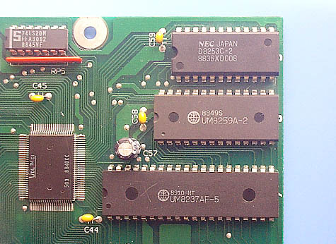 ■汎用 LSI チップのアップ。 8253 タイマ・コントローラ、8259 割り込みコントローラ及び 8237 DMA コ ントローラの各チップが見える。当時はまだ、これだけの機能を、1個のカ スタム ASIC 中に内蔵することができなかったため、この部分は、汎用 TTL を使用している。