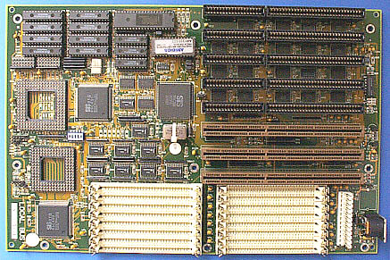 ■ローカルバススロット部分のアップ。3本あるローカルバススロットは、通 常の ISA バスとしても使用可能である。ローカルバスソケットには EISA のものを流用している。当時のローカルバスソケットは、ほとんどが EISA ソケットを流用していた。