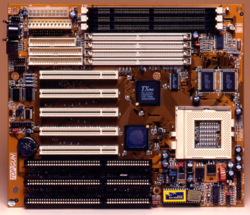 ■コメント TOPGUNの異名を持つPC CHIPS社のマザーボード、M565で す。チップセットにALiのTX−PROチップを搭載し、300MHzまで のCPUクロックと83.3MHzのバスクロックを実現していました。PC 100規格が登場する前としては、最高のスペックを持ったボードでした。 TOPGUNの名称を持つボードとしては、M575が有名です。M565 はM575が登場する直前、プレリリースのような形で製品化されたものでし た。チップセットはM575と同じTX−PROを搭載していましたが、オン ボードサウンドチップは非搭載となっています。ほとんどのマザーボードに、 オンボードで3D Sound Proを搭載してきたPC CHIPS社と しては珍しい仕様であると言えます。その代わり、PCIバススロットは5本 も用意されていました。拡張性を重視した製品と言えます。 M565では基板上に誇らしげに「TOPGUN」のシルク印刷があります が、M575では無くなってしまいました。どのような事情があったのかは不 明です。ATXフォームカードの搭載方法も、M575と異なっています。 M565では、基板上のヘッダからケーブルを介してブラケットを接続すると いう、ATXフォームカードとしては一般的に採用されている方法を採ってい ましたが、M575では基板上のヘッダピンに直接ブラケットを接続する方式 となっており、ケーブルが省略されました。 PCIスロットの数が多いことや、オンボードのサウンドチップが無いこと 及びATXフォームカードのヘッダピンの位置が異なっていることから、 M565とM575とでは微妙に部品レイアウトが異なっています。