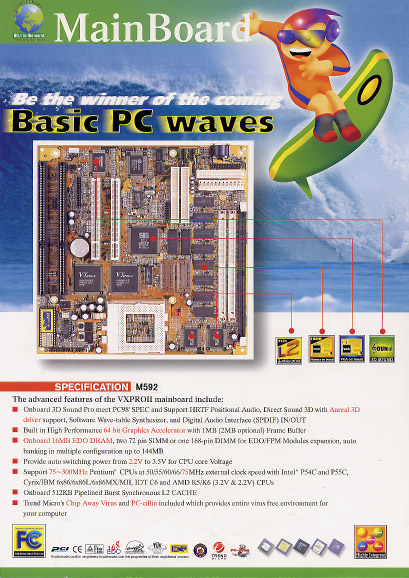 ■台湾のマザーボードメーカー、PC CHIPS社のSocket7マザー ボード、M592。ベビーATサイズのボードで寸法は22×22cm。 1998年前半の製造。ビデオチップとVRAMをオンボードで搭載し、な おかつEDOのメインメモリまでも実装した、オールインワンボードのハシ リとも言うべき製品である。 ■チップセットにVX Pro−IIを搭載。同チップはUtronというベ ンダーが供給したもので、2チップ構成。チップの型番は下記の通り。 ・HT82C371USB−II ・HT82C437VX−II ■intel Pentiumの他に、Cyrix/IBM、AMD、IDT の各CPUが使用できた。CPUクロックのサポート範囲は75〜233 MHz。外部バススピードは50/55/60/66/75MHz。 ■ISAバスを2本、PCIバスを2本搭載。72Pin SIMMスロット を2本、168Pin DIMMスロットを1本搭載していた。また、オン ボードで16MBのEDO−RAMも実装しており、メモリの最大搭載容量 は144MBとなっていた。 ■オンボードで512KBのレベル2PBSRAMキャッシュメモリを搭載。 キャッシュメモリチップにはUMC社製のUM61C3264AF−6を2 個使用している。 ■オンボードでビデオ機能を内蔵。ビデオチップにはSIS社のグラフィック スチップ、SIS6215(1998年17週製造)を搭載していた。この ビデオチップは64ビットの2Dグラフィックアクセラレータを内蔵したチ ップである。VRAMもオンボードで実装しており、標準で1MB、オプシ ョンで2MBまで拡張することができた。掲載したボードは、2MB版。 ■オンボードI/Oは、IDE2系統とFDD、シリアル×2、パラレル×1 及びサウンド機能。I/O制御チップには、UMC社製UM8670F(1 998年11週製造)を搭載。サウンドチップは3D Sound Pro PCI版を搭載しており、HRTFポジショナルオーディオやSPDIF入 出力を備えていた。 ■BIOSはAMIBIOSを搭載。 ■以下にボードのスペックを示す。
