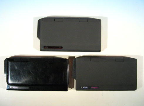 3種類のパームトップ ATARI Portfolio系の3つの機種を並べて撮影。上段がDIP POCKET PC。下段左側のテカテカと光った端末は、ATARI Portfolioのプロトタイプ。下段右側がPortfolio量産タイプ。このような光景は、滅多に見られるものでは無いと思うよ・・・ |