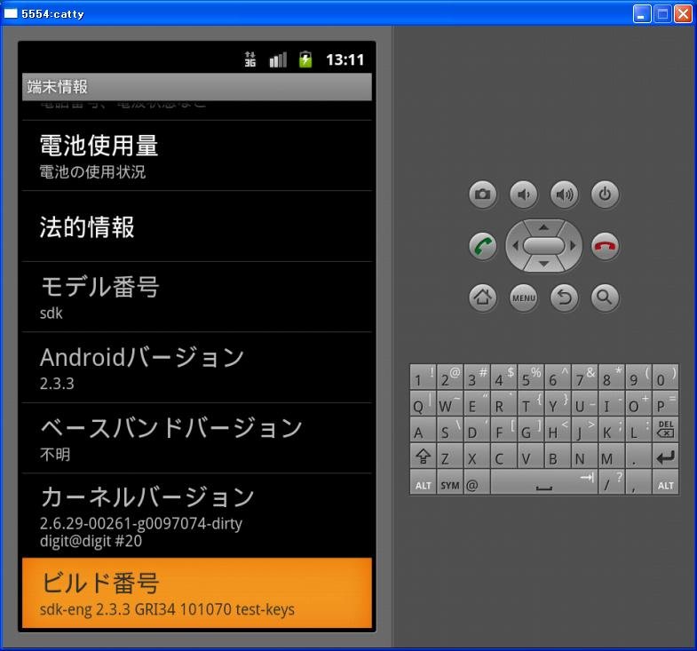 AVMで作成したAndroid Ver 2.3.3 Android SDKの「AVD Manager」を使用して、Ver 2.3.3の仮想Android端末を作成した。画面は端末情報を表示させたところ。どうやらエミュレータにはqemuを使用しているようで、CPUパワーが貧弱なマシンだと、激重の動作だ。。。 →高解像度JPEG |