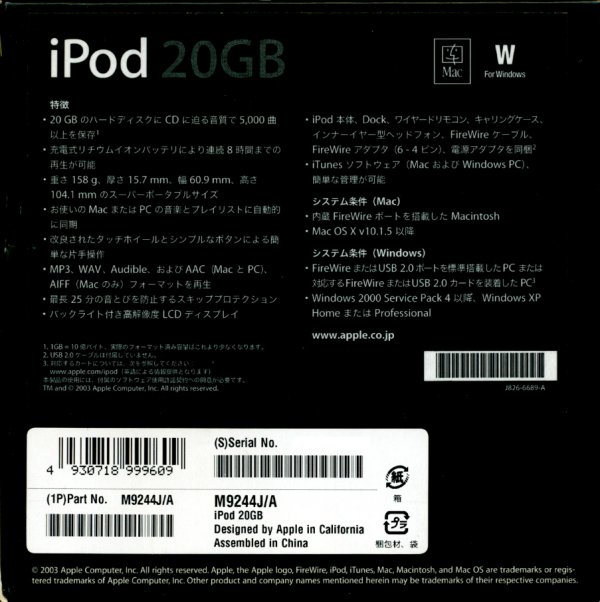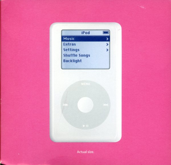 最初にパッケージ(外箱)であるが、どの世代も一辺約14.5cmの立方体である。今日のiPod系製品の簡素なパッケージからすると、随分と大袈裟に思える。それくらい、当時は「お高い」ものだったのであろう。外箱の造作はどれも同じ構成で、箱の中央が二分し、それぞれの部分に、本体とアクセサリが収納される。外箱デザインは、第1〜第3世代は、ほぼ似かよっているが、2004年に発売された第4世代は、原色を使用したPOPな感じとなり、これまでの基調とは一転している。