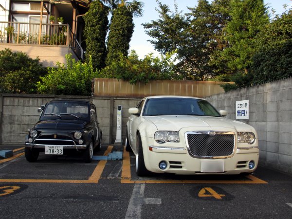 ■デカイ!(2013/08/28) 北の高気圧が張りだしてきた影響か、最高気温は32℃と高いが、湿度が低いため過ごしやすくなってきた。夕方、500で買い物に出掛ける。いつものコインパークに駐車。隣りは多分キャディラック・・・だと思うんだけど、今一つ自信が無い。まあ、とにかくデカい。デカ過ぎる。500と比較すると、全長が倍半分近くも違う。筆者宅近くは道が狭いので、さぞかし取り回しに苦労してると思う・・・