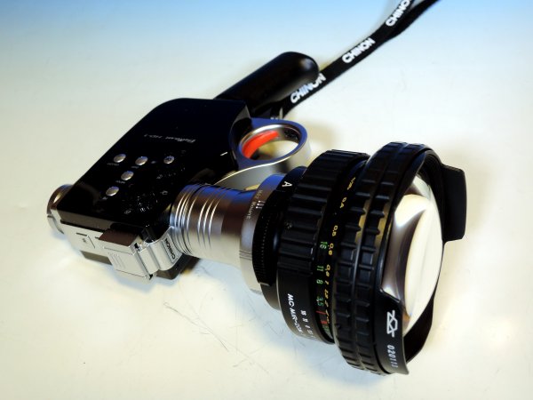 ■MIR-20M+Bellami HD-1=変態! おバカなコトを真面目にやろうとすると、それなりの準備が必要になる。このほど、その準備が整った。どういうコトかと言うと、CHINON Bellami HD-1に、ロシアカメラの老舗、ZENIT社のMIR-20Mレンズを搭載する、ということだ。 「オマエは何を言ってるんだ?」 と怪訝な顔をされそうだが、説明しよう。 CHINONの8mm風デジタル動画撮影カメラ、Bellami HD-1には、往年のレンズを使って撮影できるという、団塊勝ち組オヤジたちが好みそうな、これまた盆栽趣味のように味わい深い楽しみ方がある。HD-1にデフォで付属してくるレンズは、f=4mm、開放絞りF1.2のDマウントレンズであるが、この他にもCマウント、CSマウント、そしてM42マウントといったレンズも、アダプタを介して搭載することが可能だ。 普通のヒトだったら、昔の8mmに使用していたオールドレンズを搭載して楽しむところである。ところが、筆者はこのBellami HD-1というマシンに、ロシアカメラの変態レンズを付けてみたくなった。そのために、本体購入時にオプションであるM42アダプタも同時に入手していたのである。搭載するレンズは、かのZENIT社製造の広角、MIR-20Mである。ここで、このMIR-20Mなるレンズについて簡単に触れておこう。