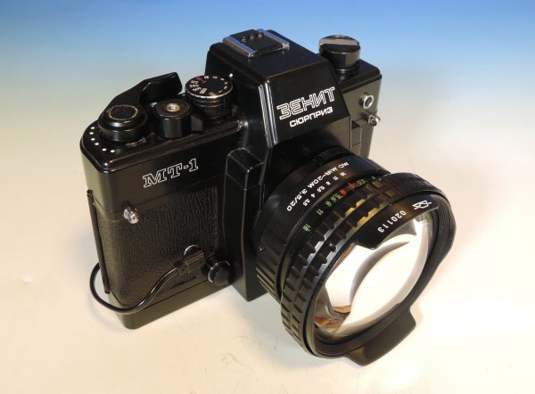 これが、本来の使い方であった。ZENIT MT-1に搭載したMIR-20M。ハーフサイズの一眼レフに20mmのレンズを搭載し、ハーフで広角画像を撮そうというのが、所期の目的だった。この状態で、総重量は1kgを越える。 |