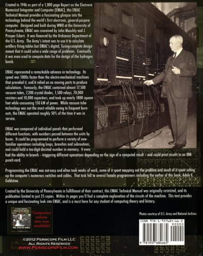 「ELECTRONIC NUMERICAL INTEGRATOR AND COMPUTER (ENIAC) OPERATING MANUAL」裏表紙。 2012年にPERISCOPE FILM LLCより出版された書籍。 →拡大 |