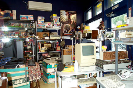 写真2:店舗内部 #1 Shop内の写真1と反対側の光景です。右側手前に初代マックプラス、左側にNextが配置されています。Nextのディスプレイの向こう側には、ガラス製の大型ショーケースがあります。もともとこのショーケースは、前のオーナーがガラス細工を陳列するために設置していたもので、店舗の備品でした。宝飾類を入れるのに適したケースなのですが、実際にはFunky Goodsのお宝グッズが入っています。ちょっと場違いな感じですね。ショーケースの隣には、5段構成の展示棚が置かれています。棚の最上段(5段目)には、サンダーバード関連を中心としたプラモデル類を展示しています。4段目には、ミタカ電気製のST管式真空管ラジオ「Aria」とMT管方式の小型ラジオ数台が展示されています。「Aria」は木製筐体の大型ラジオで、マジックアイはついていません。3段目には、ナショナルのマジックスーパーラジオと、同じくナショナルの昭和42年製CB無線機が展示されています。マジックスーパーラジオはプラスチック筐体のもので、MT管のマジックアイが付いています。またこの段には昭和34年製の手榴弾型の消火器といった、極めてレアな物もあ ります。2段目には、1967年製造のCasio計算機、101Eが目を引きます。展示棚の右上方には、映画「ブレードランナー」の大型ポスターが架かっています。この映画は店主が最も好きな作品の一つで、高円寺のポスター専門店「ピー・ドッグ」からフレーム込みで購入したものです。この写真の向かって右側が、店舗入り口です。 |
